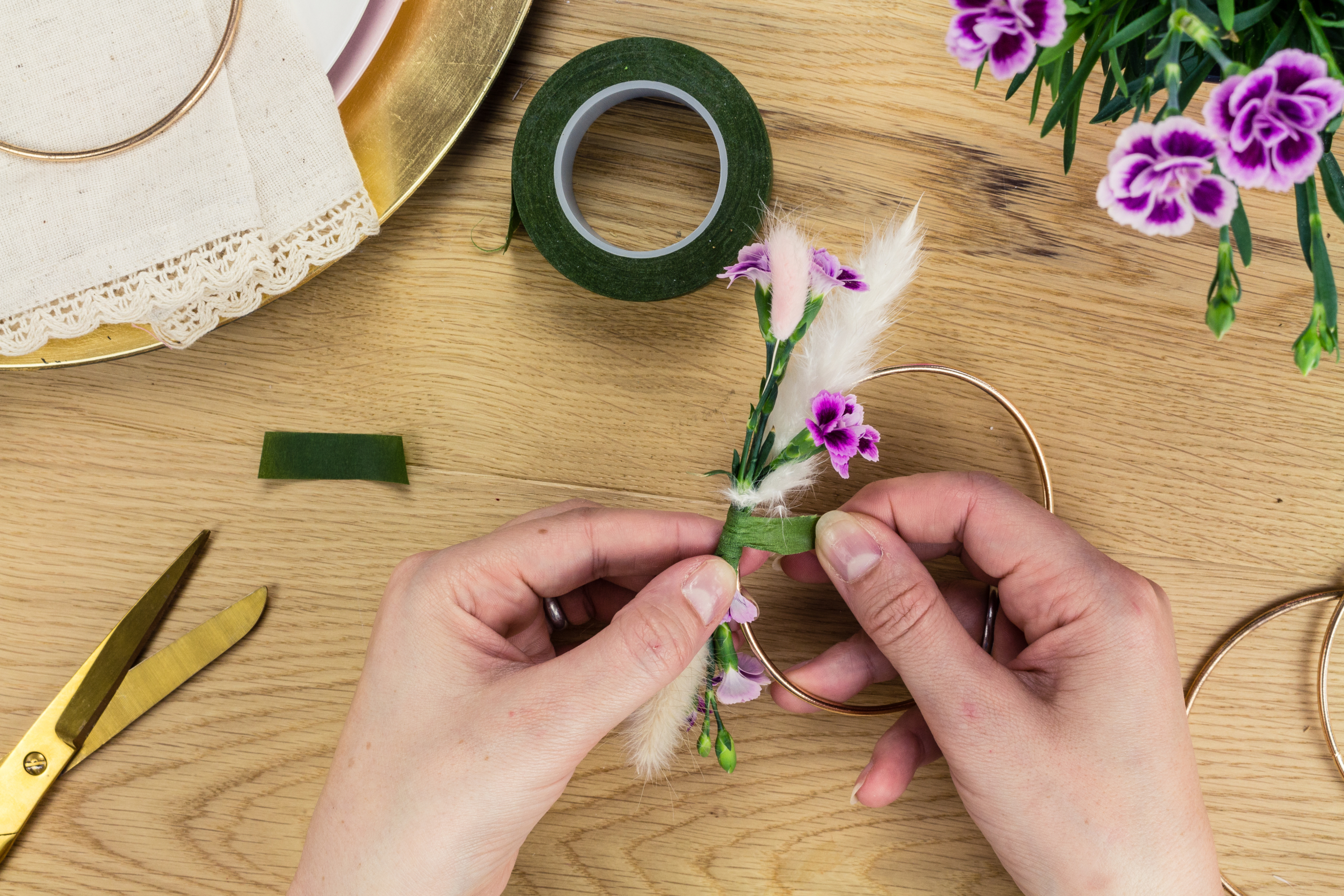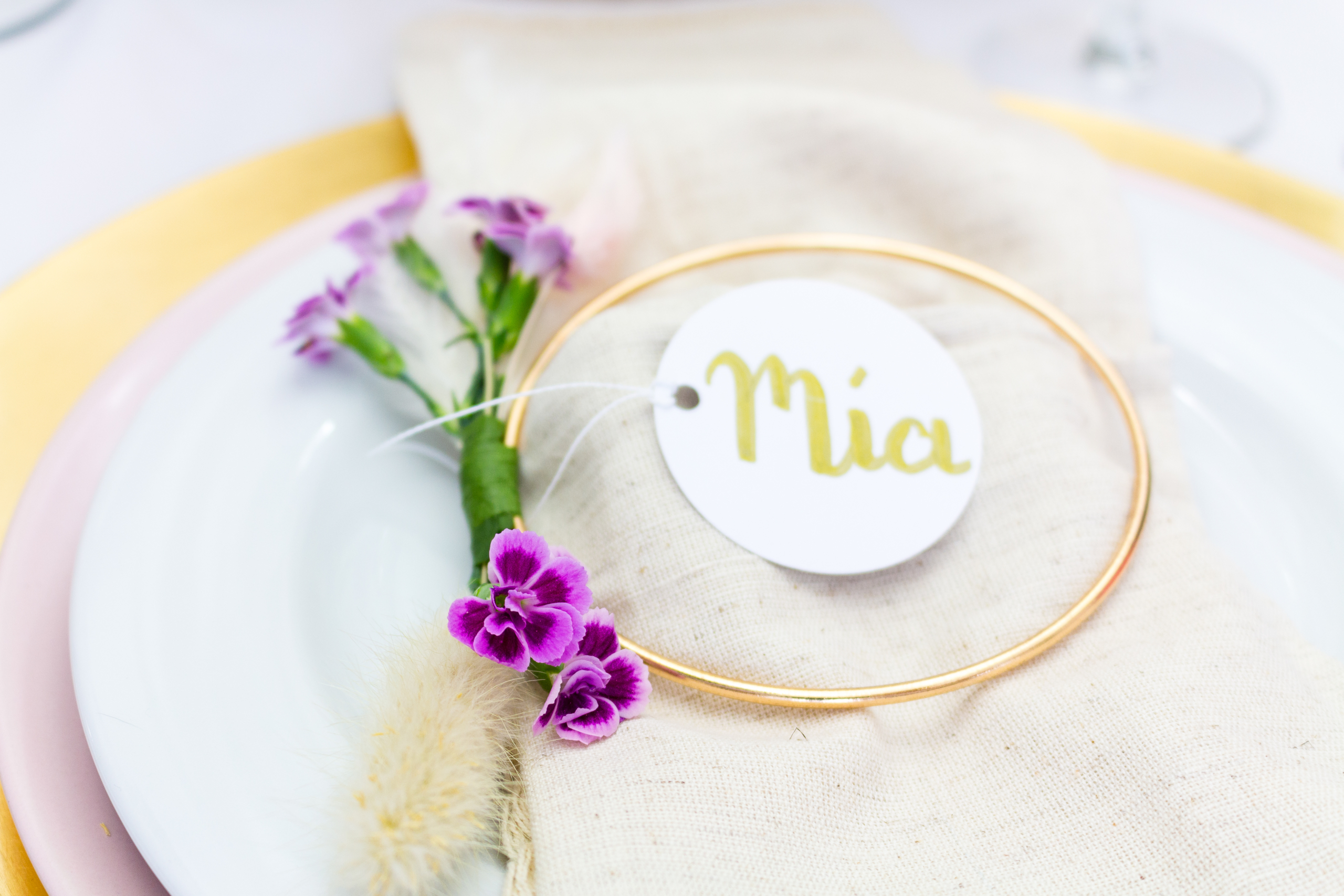 Benutz wieder das Floristenband, um die Sträußchen am Drahtring zu befestigen. Schreibe den Namen eines Gasts auf einen weißen Papierkreis von ca. 5 cm Durchmesser, loche ihn und binde ihn mit Bindfaden oder Kordel am Ring über den Blumen fest.